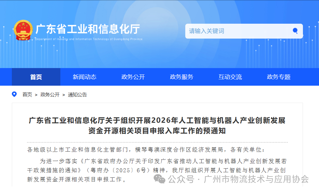 为进一步落实《广东省政府办公厅关于印发广东省推动人工智能与机器人产业创新发展若干政策措施的通知》(粤府办〔2025〕6号)精神,我厅拟组织开展人工智能与机器人产业创新发展资金开源相关项目申报工作,有关事项预通知如下: